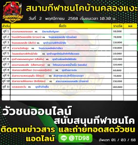 โปรแกรมวัวชน สนามกีฬาชนโคบ้านคลองแงะ 2 พฤศจิกายน 2568 รายการวัวชน