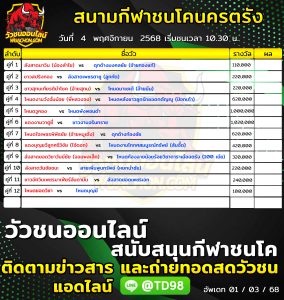โปรแกรมวัวชน สนามกีฬาชนโคนครตรัง 4 พฤศจิกายน 2568 รายการวัวชน