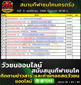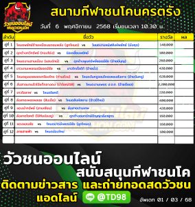 โปรแกรมวัวชน สนามกีฬาชนโคนครตรัง 6 พฤศจิกายน 2568 รายการวัวชน